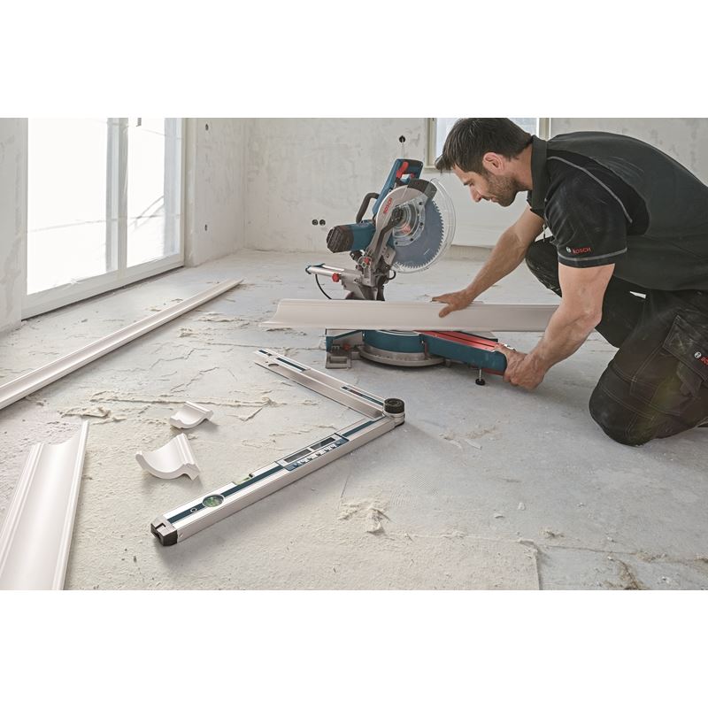 The Bosch GAM 270 MFL Digital Angle Finder and Inclinometer is five tools in one: a digital angle finder, an inclinometer, a miter cut calculator, a protractor and a digital level. The angle finder provides accurate angle targets, while the inclinometer offers precise measurements in degrees. The tool is also equipped with an integrated laser, allowing the user to transfer inclination measurements up to 100 ft. The tool has two easy-to-read illuminated, flip displays, one for the inclinometer and one for the angle finder. Users are able to easily reuse and transfer save measurements with the hold function. The cut calculator provides easy saw angle adjustments and a compound miter calculator. Users can find the miter angle using the tool's legs, which have an angle range of 0-270 degrees. The compound miter calculator is used to measure joint angles that are not perpendicular. The tool has clearly labeled buttons for straightforward calculations. The angle finder has robust housing with IP 54 protection.