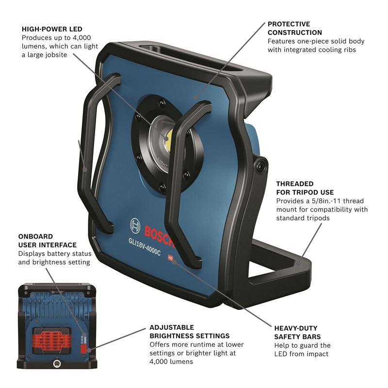 This cordless, portable floodlight with Bluetooth® provides high-powered brightness, with 4,000 lumens, which can light up a large jobsite. The Bosch GLI18V-4000C 18V Floodlight features Bluetooth® connectivity and outstanding runtime. The Toolbox App connects to the GLI18V-4000C with Bluetooth®, to control the floodlight's operation. Users can turn the light on and off remotely. They can dim the light, set it on a timer, check the battery status, and control groups of lights using a mobile device. It also has a user interface, for battery and brightness status. There are three brightness settings (4,000, 2,000 and 1,000 lumens), with corresponding adjustments in runtime. The light delivers great runtime provided by rechargeable Bosch 18V batteries (not included). The light provides 30 minutes per battery amp-hour at 4,000 lumens and up to 120 minutes per amp hour at the lowest setting. Built with a solid metal body, the floodlight two heavy-duty bars, which help to guard the LED from impact. The light has an adjustable stand for versatile positioning, a 5/8 In.-11 thread mount. This is a bare tool; the battery and charger are sold separately.