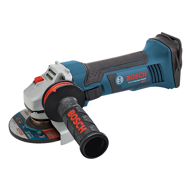 The Bosch GWS18V-45 18V 4-1/2 In. Angle Grinder is an ideal portable cordless grinder for trade professionals who need reliable, robust power. With its four-brush motor design and optimized gear structure, it provides 10,000 no-load rpm, to handle cutting and grinding applications. It features a two-position Vibration Control side handle for better handling and less operator fatigue. It is designed for long tool life, with Bosch's Electronic Cell Protection and Electronic Motor Protection as well as optimized brush design. For user protection, this cordless grinder was engineered with a quick-change, burst-resistant wheel guard and restart protection to avoid accidental startup.