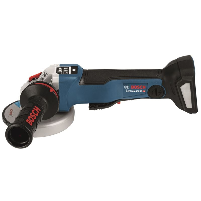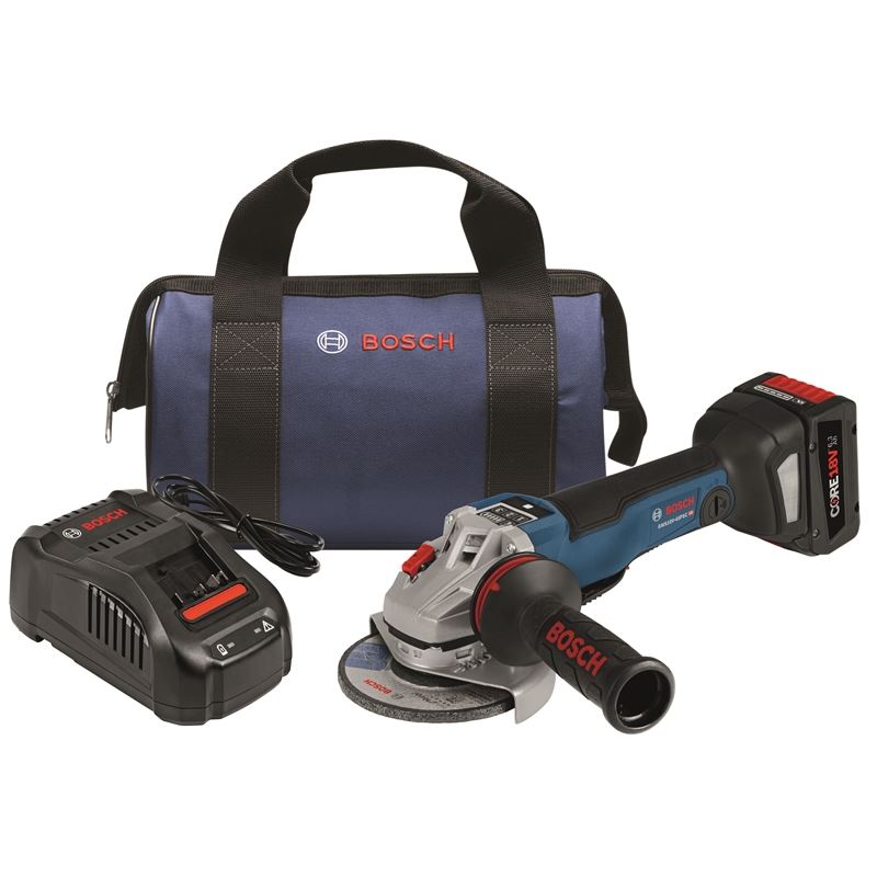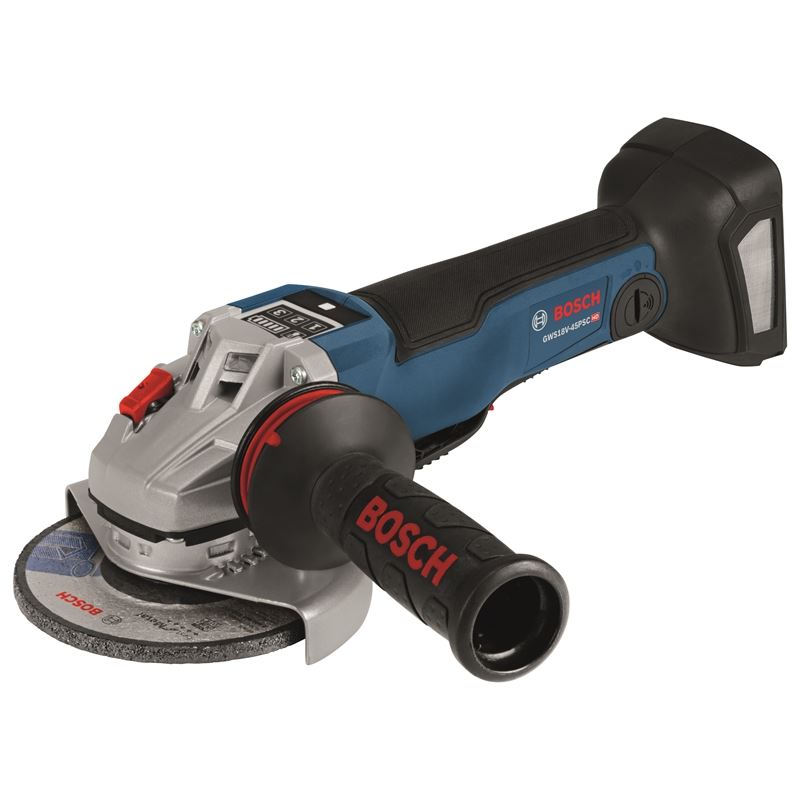 The Bosch GWS18V-45PSCB14 18V Connected 4-1/2 In. Angle Grinder with CORE18V Battery delivers the ultimate combination of performance, control and power in a cordless grinder kit. The GWS18V-45PSCs efficient EC Brushless motor has the capacity to transfer up to 35% more power and up to 110% more runtime using the CORE18V battery. The grinder features an onboard user interface for tool feedback plus speed-setting control. It also includes Bluetooth connectivity, using the Bosch GCY30-4 module to link to the free Bosch Toolbox app on a mobile phone, for more detailed feedback and enhanced tool control. It has advanced electronics for enhanced user protection, such as drop control to shut the tool off if its accidentally dropped, KickBack Control to reduce the hazard of sudden tool reactions to binding situations, restart protection and soft-start technology. It also features a burst-resistant wheel guard. This tool features a two-position Vibration Control side handle, slim soft-grip design and a large spindle lock.