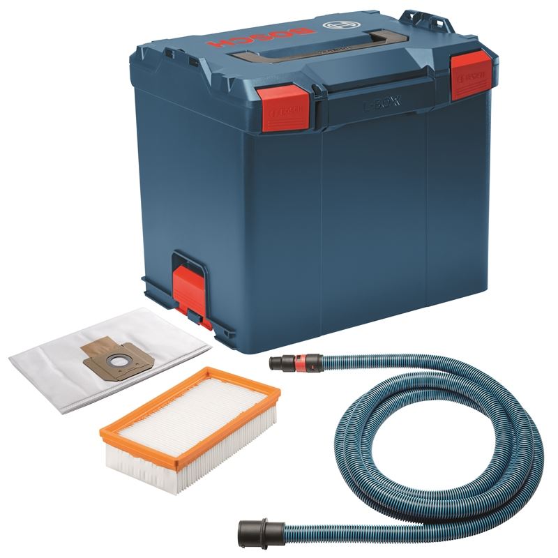 The Bosch GXA4-02L PRO+GUARD Surfacing Kit features a HEPA filter, fleece filter bag and other accessories to upgrade the VAC140-series dust extractor. The VF130H HEPA Filter captures 99.97% of particles 0.3 microns and larger, and it has a low-stick surface to enhance the filter-cleaning process. It helps users move toward compliance with the OSHA respirable crystalline silica dust regulation. The VB140F Fleece Filter Bag acts as a preliminary filter, and the port cover securely closes to keep the dust inside during disposal. The filter and fleece bag are for use in dry applications only. The VH1635A 16 Ft., 35mm Anti-Static Dust Extractor Hose is engineered specifically for Bosch VAC series dust extractors. This crush-resistant hose helps prevent static shock, and it features a locking ring that securely connects to many Bosch power tools and dust-extraction attachments. The L-BOXX-4 tool carrying case (part of the L-Boxx tool-storage system) is also included. The case integrates with the dust extractor for a mobile workstation