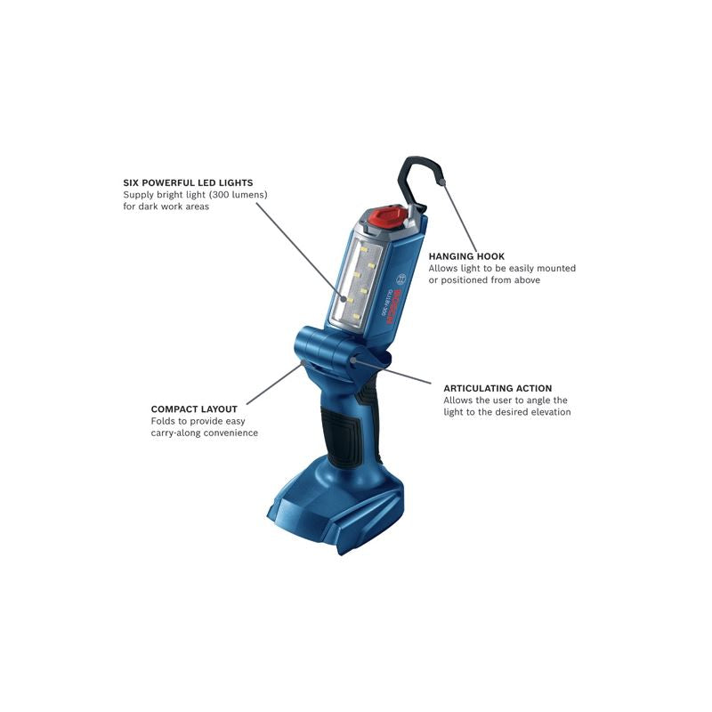 LED worklight adjusts to multiple positions to supply bright light (300 lumens), and has spotlight and flood light settings