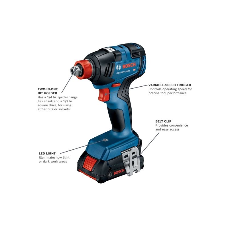 (1) GDX18V-1800 18V Brushless Two-In-One 1/4 In. and 1/2 In. Bit/Socket Impact Driver/Wrench, (1) GSB18V-490 18V Brushless 1/2 In. Hammer Drill/Driver, (1) CCS180 18V Blade-Left 6-1/2 In. Circular Saw, (1) GLI18V-300 18V Articulating LED Worklight, (1) GBA18V40 18V CORE18V Lithium-Ion 4 Ah Advanced Power Battery, (1) BAT612 18V Lithium-Ion 2 Ah Standard Power Battery, (1) 18V Charger, (1) 6-1/2 In. Circular Saw Blade, (1) 4x Bit Holder, (2) Belt Clips, (1) Carrying Ba