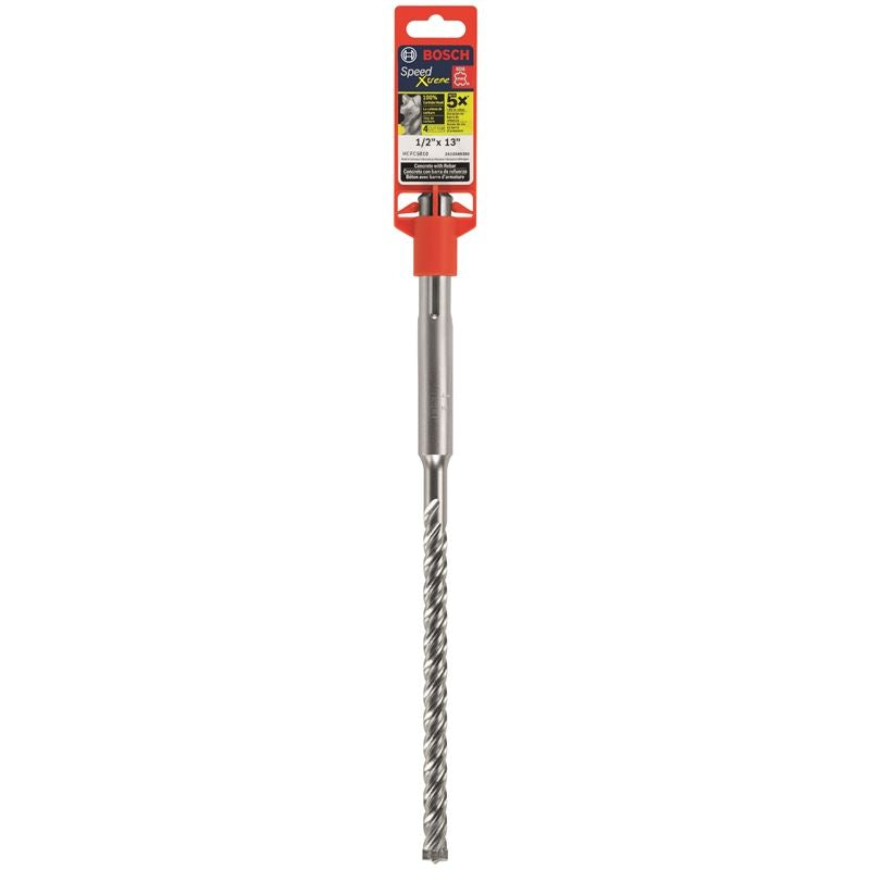 Bosch SpeedXtreme SDS-max drill bits deliver 100% carbide heads with four-cutter design, making them the toughest, long-lasting bits for drilling in reinforced concrete and hard aggregate. The bits provide 5X life vs. competition. The bits are engineered using proprietary diffusion-bonding technology, which bonds carbide and steel at a molecular level. Its a precise high-heat, high-pressure solid-state welding process that produces jobsite-proven bits. Bosch is the only concrete bit manufacturer to make its own carbide, and 100% quality check on each and every single bit. The bit has a four-cutter design with 180 cutting diameter and 100% power transfer during drilling. The active-centering tip results in rounder hole, while the four 90 side angles create a wide and sharp head keep driving precise holes. The four-flute design aggressively pulls dust away from the work, for fast drilling and longer bit life.