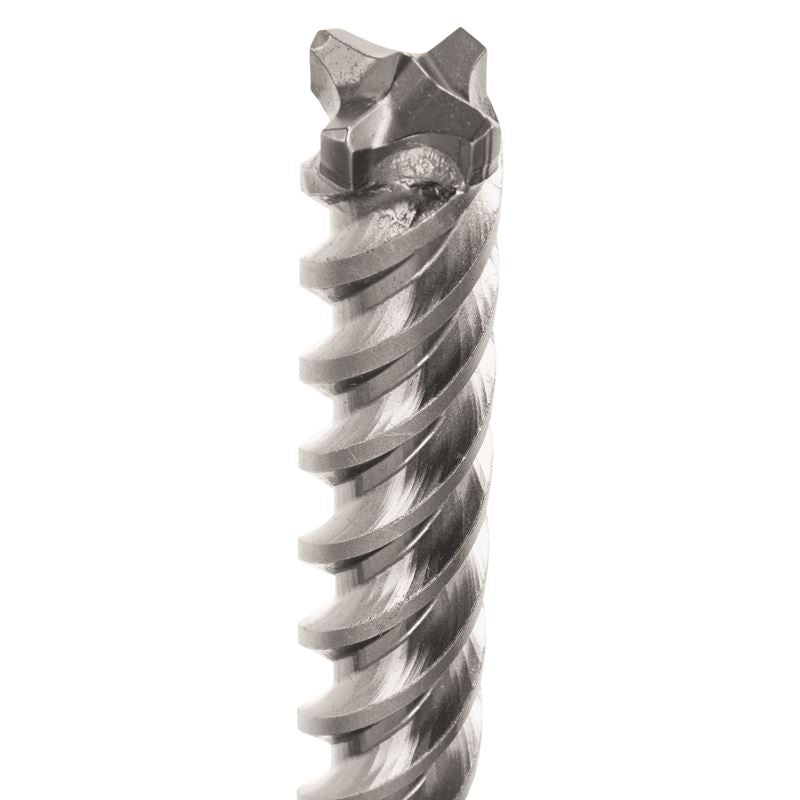Long-lasting SDS-max drill bit design - manufactured with 100% carbide head and four-cutter design, making it the long-lasting bit for drilling in reinforced concrete and hard aggregate