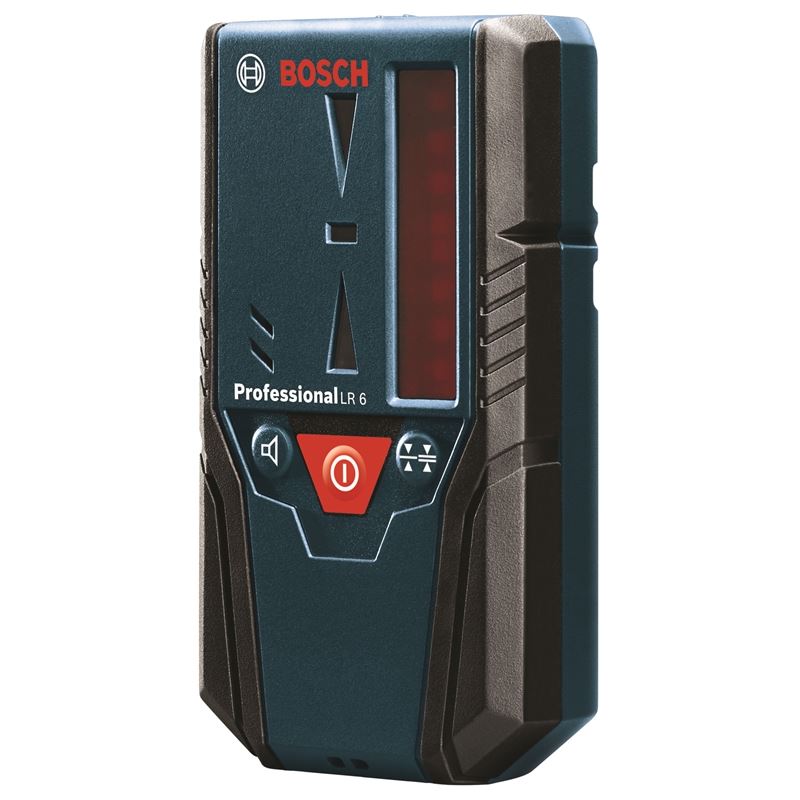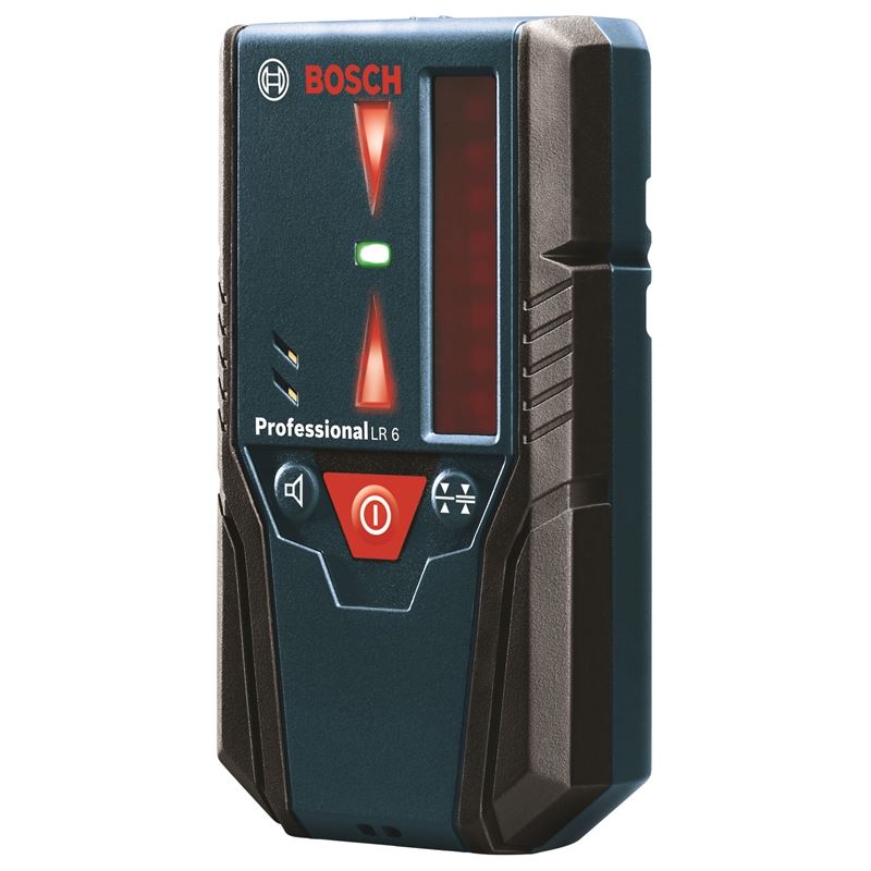 The Bosch LR 6 Line Laser Receiver allows users of the GCL 2-160 Self-Leveling Cross-Line Laser to receive the line further, with precision. The LR 6 makes line laser detection possible at distances up to 165 Ft., and it extends its operation outdoors, in bright-light conditions, or catches beams midair when there is no surface to see the beam on. The receiver's dual-sided LED arrow indicators make the receiver more flexible, and it has a volume-adjustable audio signal that give clear on-grade position indication and an accuracy button for fine or coarse adjustment. For mounting options, the receiver has built-in heavy-duty magnets that securely attach to metal surfaces, allowing easy setup on suspended-ceiling installations. The LR 6 includes a click-in mounting bracket, for simple and secure assembly, especially to a leveling rod.