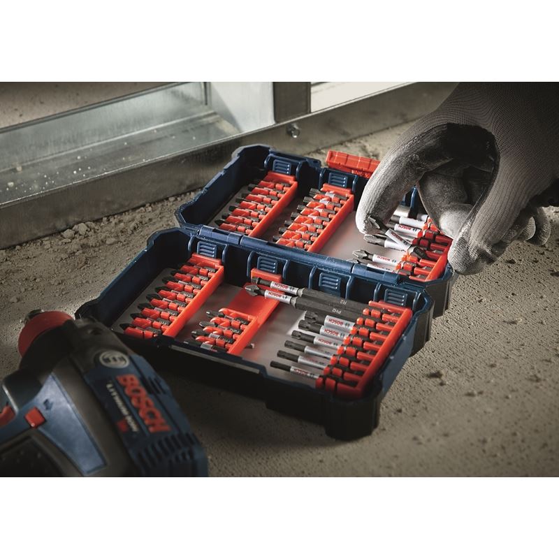 The Bosch Custom Case System is compatible with Impact Tough Bits, delivering the best case for the best bits. With the Xtended Torsion Zone, Bosch Impact Tough screwdriver bits have been upgraded to deliver 10X life over standard impact bits. The Xtended Torsion Zone absorbs torque peaks to reduce stress at the bit tips. They are designed to handle the additional torque of today's impact drivers. The durable, well-designed case provides tilt-in/tilt-out convenience for easy access to the bits. Since it's customizable, it helps increase user productivity by reducing time searching for the right bit. This jobsite tough case features a secure case latch and rubber bumpers.
