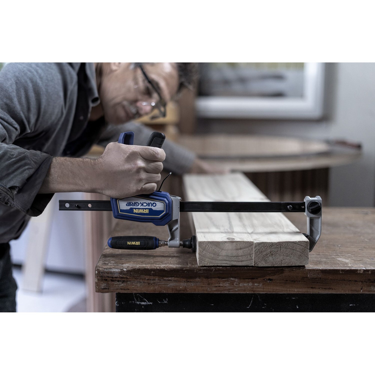 The IRWIN Quick-Grip 12" Hybrid Clamp Provides the Ability to Achieve 300lbs of clamping force with the Trigger Handle; 825lbs of clamping force with Screw Handle. Rapid Switch between Clamp and Spreader. Combine two Hybrid Clamps together with provided fasteners at 2 threaded locations on Bar for additional length - Must use both provided fasteners when coupling clamps.