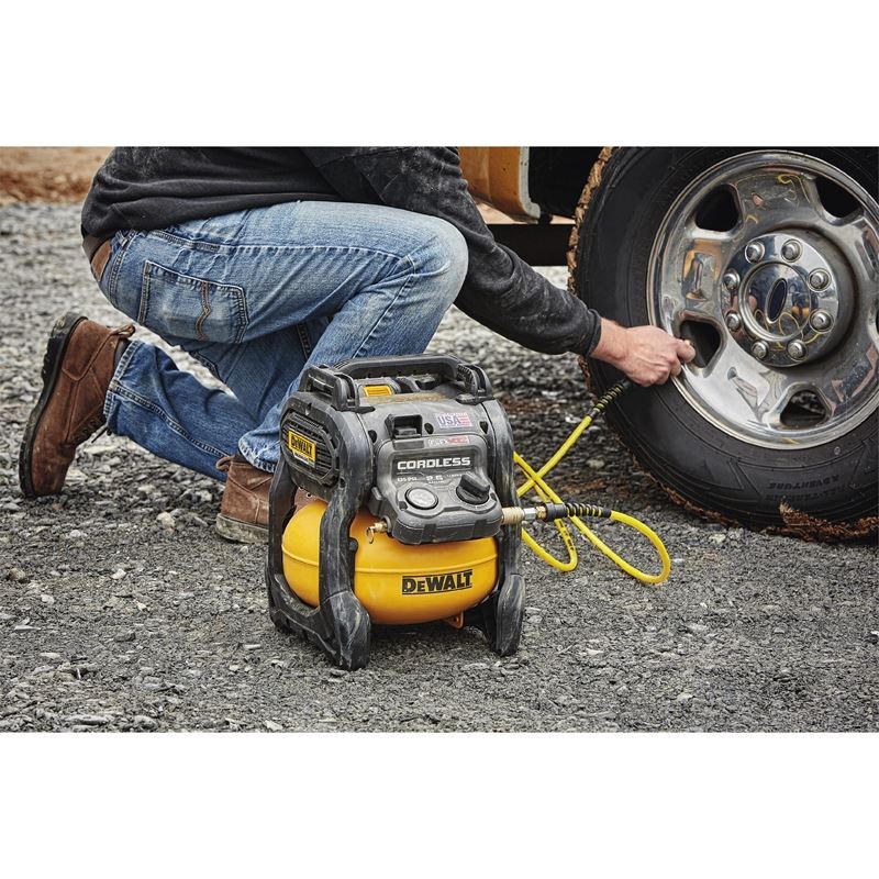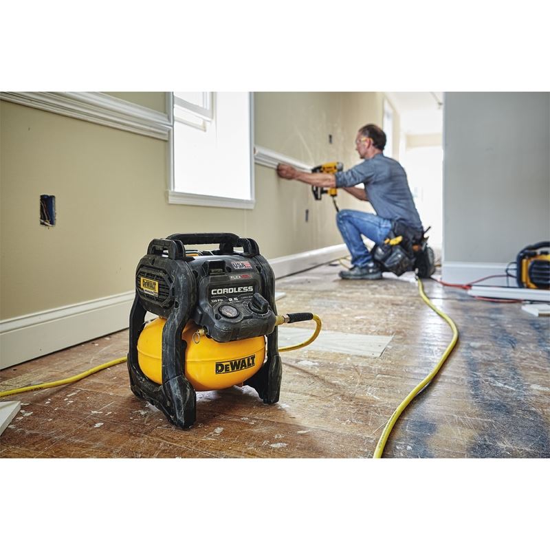 The FLEXVOLT® 60V MAX* 2.5 Gallon Cordless Air Compressor offers all of the convenience and portability of cordless, and lets you continue using the pneumatic tools you already have. Each battery charge allows for up to 1,220 nails**, providing the runtime to complete a variety of applications. Its OneTurn Regulator means you no longer have to fight with the dial. Plus, it’s made right here in the USA with global materials.