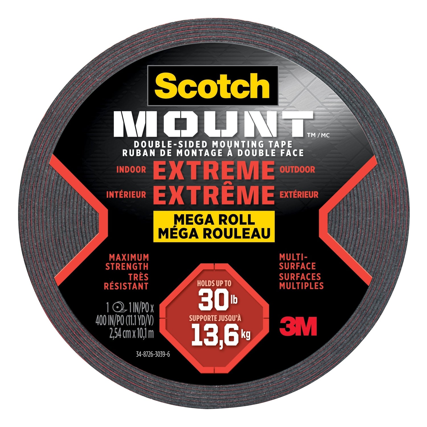 Scotch-Mount™ Extreme Double-Sided Mounting Tape Mega Roll features 3M™ Industrial Strength Adhesive. Holding up to 30 pounds (13.6 kg) - this foam tape can be used indoors and outdoors and is ideal for application on painted drywall and painted and finished wood.
