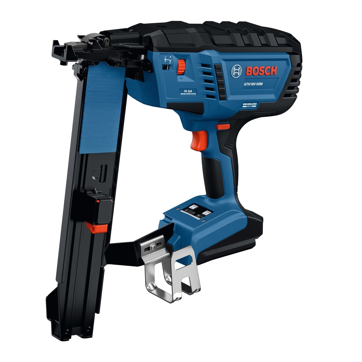 The Bosch GTH18V-50M 18V Brushless 16-gauge Medium Crown Stapler offers a robust, cordless solution for professionals looking for the power and precision needed to sink 7/16 In. staples efficiently. By eliminating the hassle of compressors and hoses, it helps deliver enhanced productivity, especially while navigating tight spaces and hard-to-reach areas. The stapler is ideal for installing roof and wall sheathing, vinyl siding, flooring, and even shipping crate assembly and pallet building. The 16-gauge Medium Crown Stapler has a magazine capacity of 150 staples . When paired with a CORE18V® 4 Ah battery (sold separately), it can fasten up to 1,100 2 In. staples per charge for fewer interruptions in the workday. Bump-fire mode delivers 3 shots per second in OSB material, and an LED light illuminates the work area for more precise and efficient fastening. Engineered for accuracy, the stapler features a nosepiece that grips the workpiece to help prevent slipping during operation. Make easy and precise adjustments to the depth setting with the ergonomic thumb wheel. Minimize downtime on the job with the tool-free jam release mechanism. An intuitive user interface allows for quick and easy tool activation and toggling between single and bump-fire modes