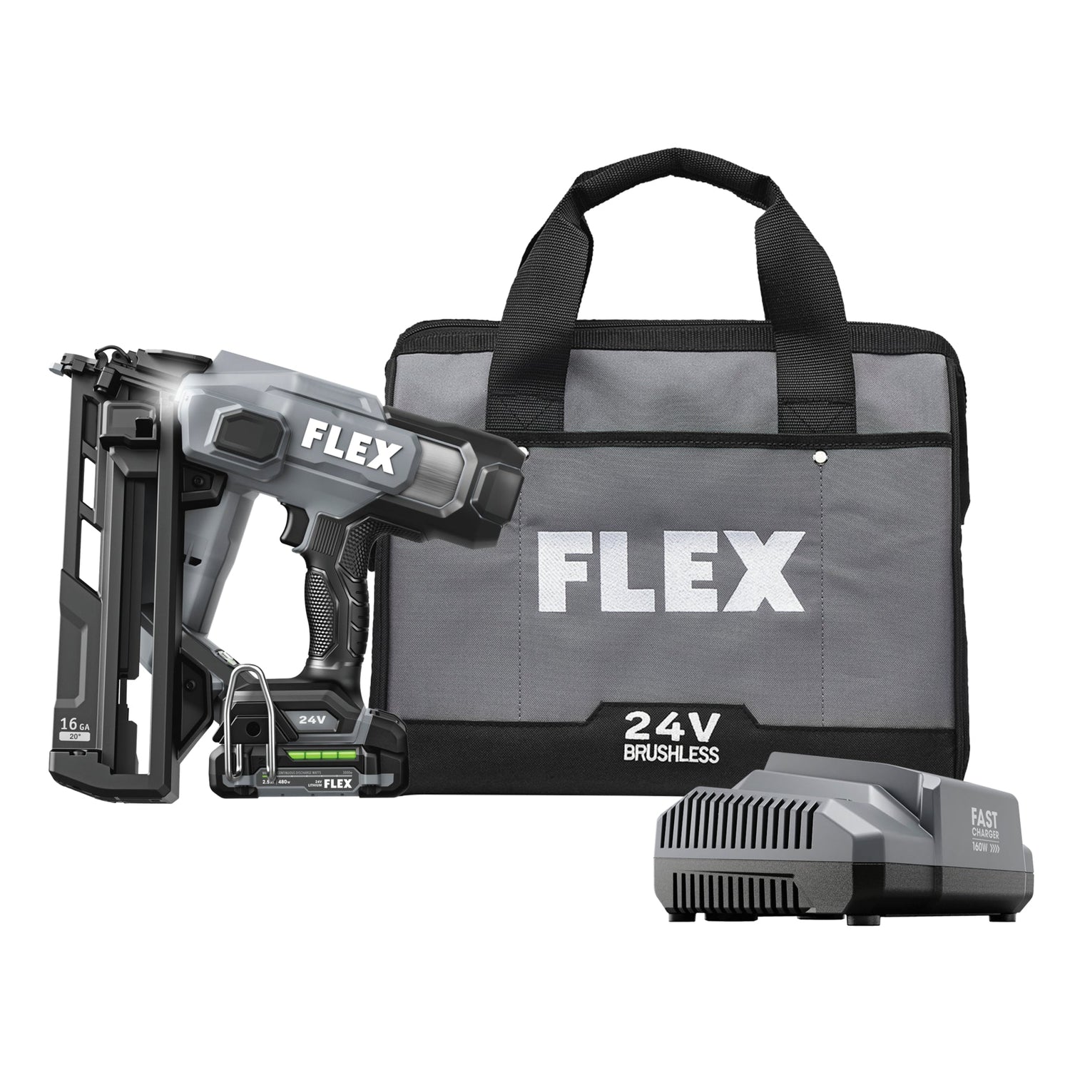Power through moulding and trim installation with the FLEX 24V Brushless 16Ga Angled Finish Nailer. This cordless finish nailer delivers high-speed power by driving up to 3 nails per second with zero ramp up time. It drives up to 1,500 nails on a single charge with a 2.5Ah lithium-ion battery for extended runtime. The nail gun features an ergonomic quick depth adjustment lever to easily set the ideal nailing depth when driving fasteners, and its triple LED light delivers shadow-free illumination for better visibility in dark work areas. The cordless nail gun toggles between bump and sequential firing modes and has a nail indicator to easily see how many nails remain in the magazine. Dry-fire lockout avoids blank firing and damage to your work when the nail supply is exhausted. Tool-free jam clearance allows you to quickly clear jammed nails without tools for maximum efficiency when you’re on the job. The cordless nailer is compact and lightweight to conquer tight spaces with minimal fatigue. Its heavy-duty belt clip can be mounted on either side of the tool and features a lead-in profile. The finish nailer accepts 1-1/4-inch to 2-1/2-inch 16-gauge fasteners. This cordless nailer delivers the FLEX Advantage of unmatched battery power, runtime, and fast charging. Kit includes the 16Ga Angled Finish Nailer, 2.5Ah lithium battery, 160W Fast Charger, belt clip, (3) no-mar tips, and a FLEX bag.