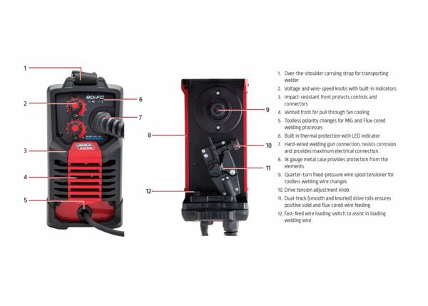 WELDING CAPABILITES: Flux-cored welding up to 120 Amps and a maximum thickness of 1/4”