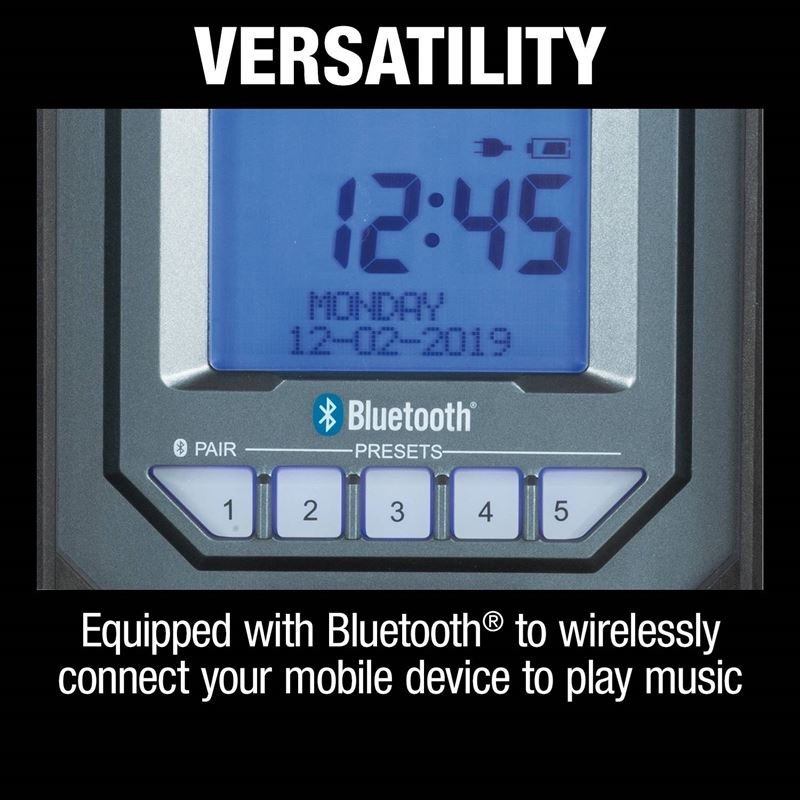 Listen to music on or off the job site with the new Makita 18V LXT / 12V max CXT Cordless Bluetooth Radio. The radio delivers rich, full stereo sound from two powerful 3.5†side-firing speakers. Users can listen to the digital tuner, a mobile device wirelessly connected via Bluetooth, or an MP3 player via the auxiliary port.