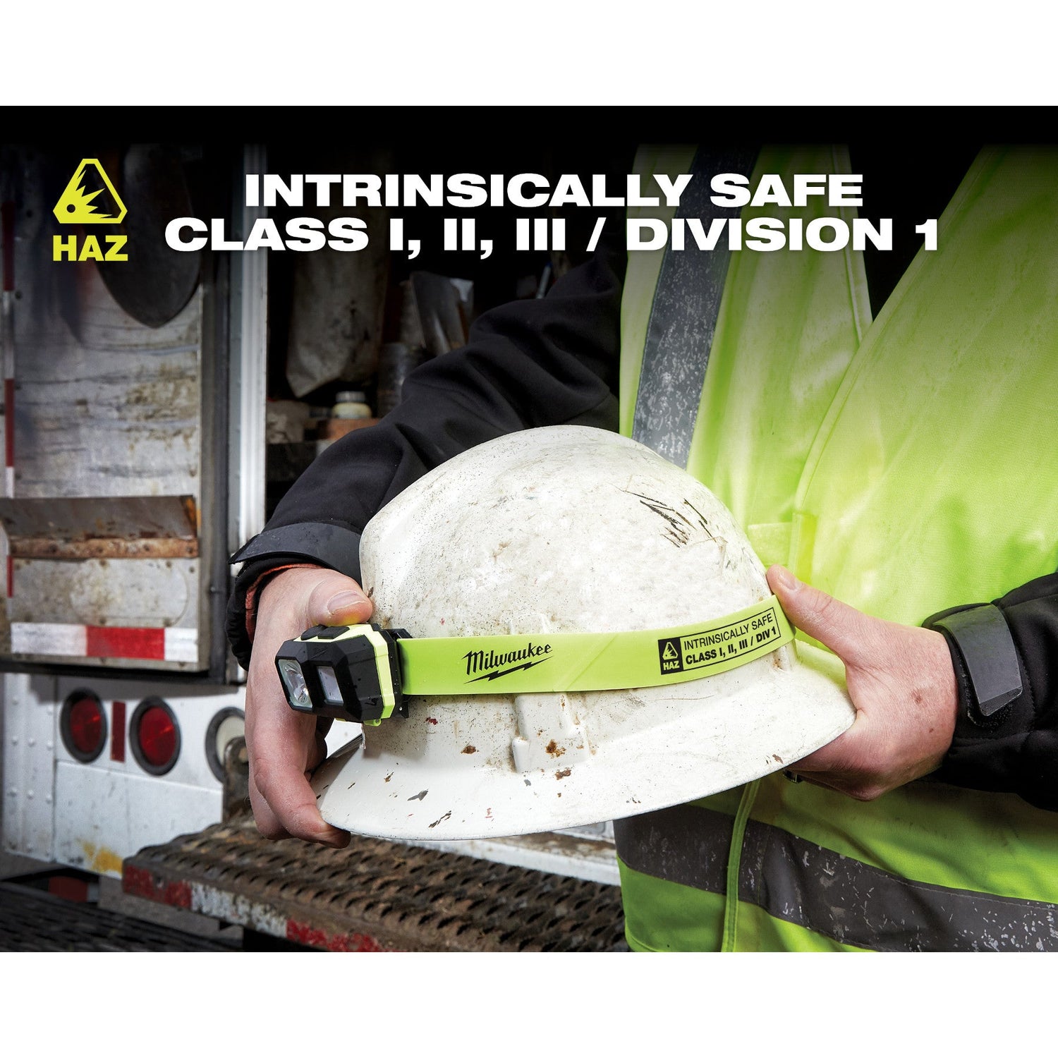 Our Intrinsically Safe Class I, II, & III / Division 1 Spot/Flood Headlamp sets a new standard for hazardous location personal lighting, delivering GREATER VISIBILITY, HIGHER OUTPUT, and NO COMPROMISE to size or safety. The headlamp is rated for Classes I, II, and III, Division 1, delivers you with 310 Lumens of TRUEVIEW™ High Definition Output, and can reach a beam distance of up to 100 meters. With a lightweight, compact design, there is no compromise to size for output and performance. Designed with the safety manager in mind, this hi-visibility headlamp has explicit on-tool and on-strap intrinsically safe logos for easy identification, even at a distance. Powered by 3 AAA batteries, this spot and flood headlamp provides you with up to 40 hours of run time and features 5 output modes to manage your brightness and run time. This head torch is IP64 rated, making it dustproof and water-resistant. It includes a rubber strap optimized for hard hat use, a nylon strap for bare head use, and a Dual Lock™ adhesive allowing you to connect it straight to a hard hat. The LED headlamp also comes with four hard hat clips and three AAA batteries. The intrinsically safe headlamp allows you to direct the pivoting light head using seven adjustable positions and is covered by our MILWAUKEE® limited lifetime warranty