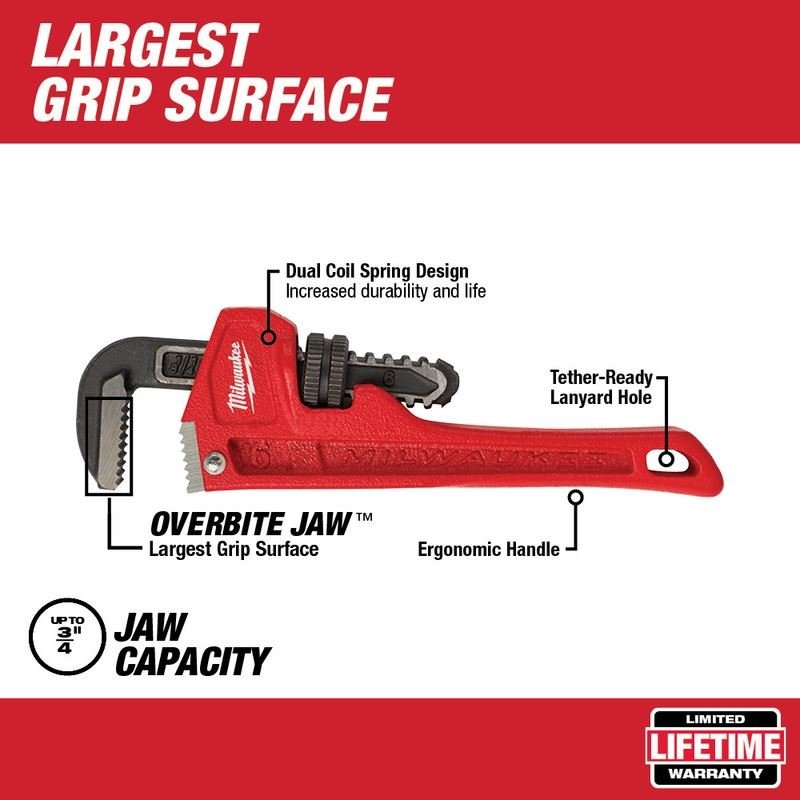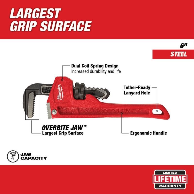 Our Steel Pipe Wrenches have been designed from the ground up to offer you maximum productivity. Our Steel Pipe Wrenches feature an OVERBITE JAW design giving you the largest gripping surface while using the wrench. Dual coil springs give you maximum durability and tool life. The wrench handle's ergonomic form has been designed for maximum comfort and won't dig into your palms while in use. Tough hardened jaws give you increased grip and tooth durability while a tether-ready handle loop makes our steel pipe wrenches perfect for the toughest of job sites. MILWAUKEE stands behind their product and offers a Limited Lifetime Warranty with all steel pipe wrenches