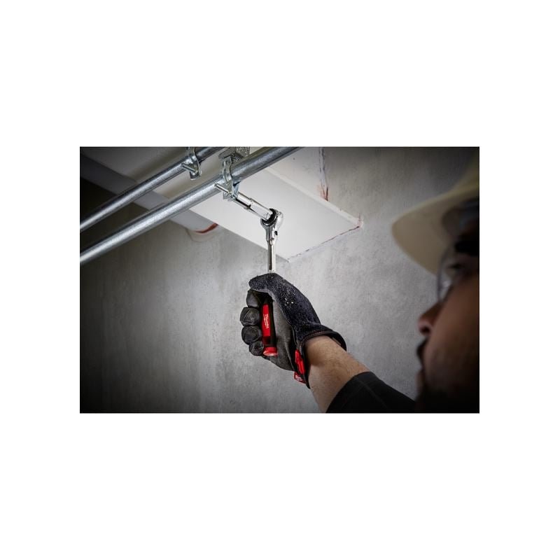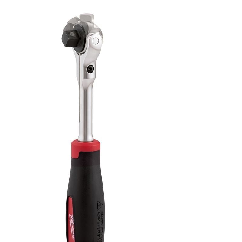 Milwaukees 12 pc. 3/8 in. drive ratchet set delivers ultimate versatility and access. The slim-profile ratchet features a pivoting head that can be used as a ratchet, a nut driver, or any angle in between. Milwaukees proprietary sockets feature a parallel flat design for wrench compatibility and to deter rolling. Socket sizes are stamped into the flats for improved visibility. The kit is stored in a soft-sided carrying case that includes a socket rail to keep sockets and accessories organized, both on and off the jobsite.