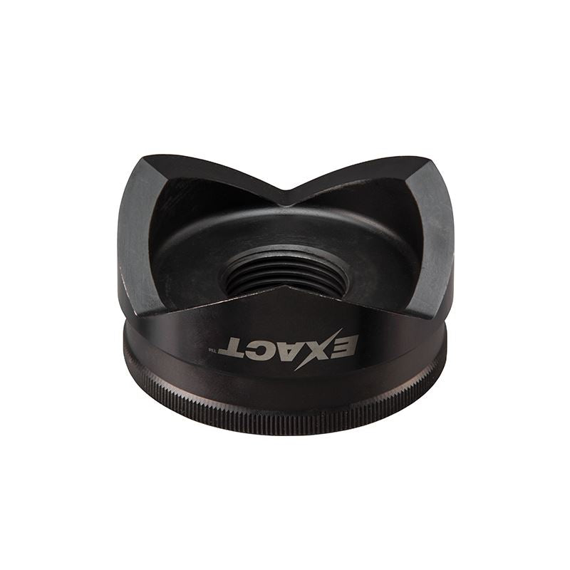 EXACT punches and dies have innovative features which bring value for the contractor. Heavy duty, they can punch holes in both mild and stainless steel material. Engraved crosshairs on the dies deliver clearest alignment with pre-drawn crosshairs. Both the tooth geometry of the punches, and slug removal ports on the dies, provide optimal slug removal. Large size ID markings on both the punches and dies permit easy punch and die selection. EXACT punches and dies do not require spacers. Finally, notches on the punches allow for better grip during punch threading and de-threading. Altogether, EXACT punches and dies make the knockout process easier!