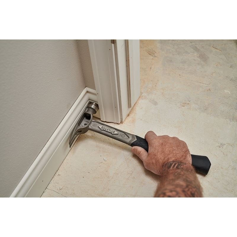 The STILETTO 10oz TRIMBONE Hammer with Smooth Steel Face and Curved Handle is designed for finish with specialized features. This titanium hammer is 45 percent less weight and hits like steel. The compact D-Face and Trim Claw are ideal for tight spaces. The TRIMBONE also features a steel face and a replaceable grip, available in 5 colors. extending the life of the hammer and providing a personal touch. The 180? side nail puller is ideal for 2D-10D nails but has the power to pull up to 16D.