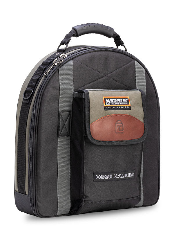 The HOSE HAULER is a versatile storage solution that is specifically designed with HVAC technicians and plumbers in mind. It can store vacuum pump hoses, micron gauges, valve core removers, adapters, a bottle of vacuum pump oil and basic hand tools needed for perfoming an evacuation on an HVAC system. The HOSE HAULER features a removable interior pouch and 2 removable storage dividers, allowing for customization of the interior storage layout. The bag also features a water/oil resistant interior for easy clean up.