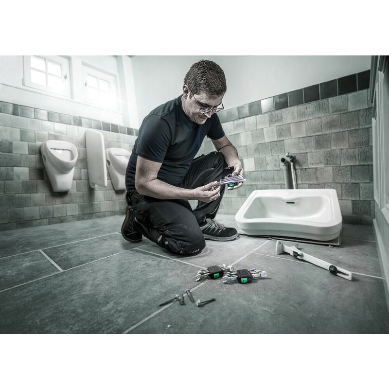As the installation space becomes increasingly tight during screwdriving, it is necessary that tools enable users to work successfully even in such situations. Narrow spaces require additional placement points of the tool. Can spanners be modified to increase the placement possibilities of the tool? The combination of the 7.5 degree pivoted mouth and the double hexagon geometry doubles the placement points. A repeated 180 degree turn of the wrench around the longitudinal axis during screwdriving provides four placement possibilities, and bolts or screw heads can be engaged every 15 degree . The Joker 6003 with its smart mouth geometry significantly expands the range of uses in confined spaces. The Joker 6003 will automatically find the respective placement point after every turn. The slim yet robust ring side is angled by 15 degree to the tool axis. The high-quality surface treatment achieves a high and long-lasting corrosion protection. With Take it easy tool finder: Colour coding by size. The wear-free material of the clip guarantees easy removal and a secure hold of the spanners.Ring spanner set, mouth side pivoted by 7.5 degree