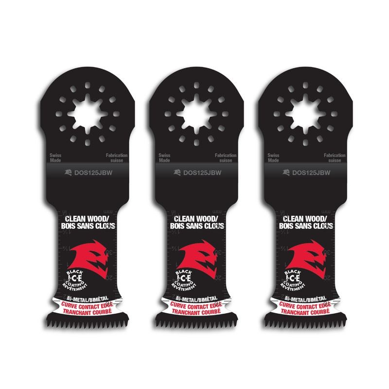 Diablos Starlock bi-metal oscillating blades feature application specific designs that deliver maximum durability and longer life in clean wood applications. These high-performance blades feature an ultra-hardened cutting edge to deliver up to 5X longer life than standard blades. Curve contact edge creates a pilot for precise, clean plunge cuts with less vibration. An optimized Japanese tooth design and Black I.C.E. (Industrial Cooling Element) keeps the teeth cool and build up free for fast, clean cuts. Tool free quick-change interface fits Fein and other Starlock tools; also compatible with most non-Starlock multi-tools.