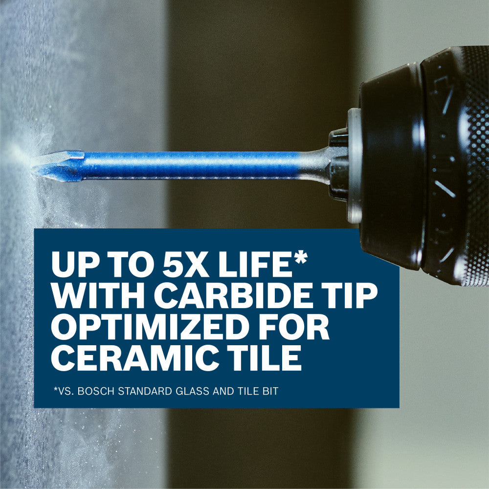 Up to 5X more life – with carbide tip optimized for ceramic tile (versus Bosch glass and tile drill bits)