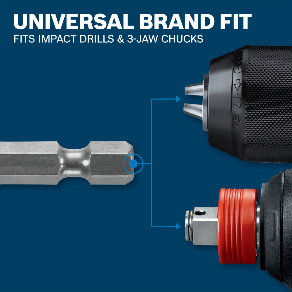 Universal brand fit – impact-rated hex shank provides compatibility with 1/4” hex impact drill/drivers and 3-jaw chuck drill/drivers