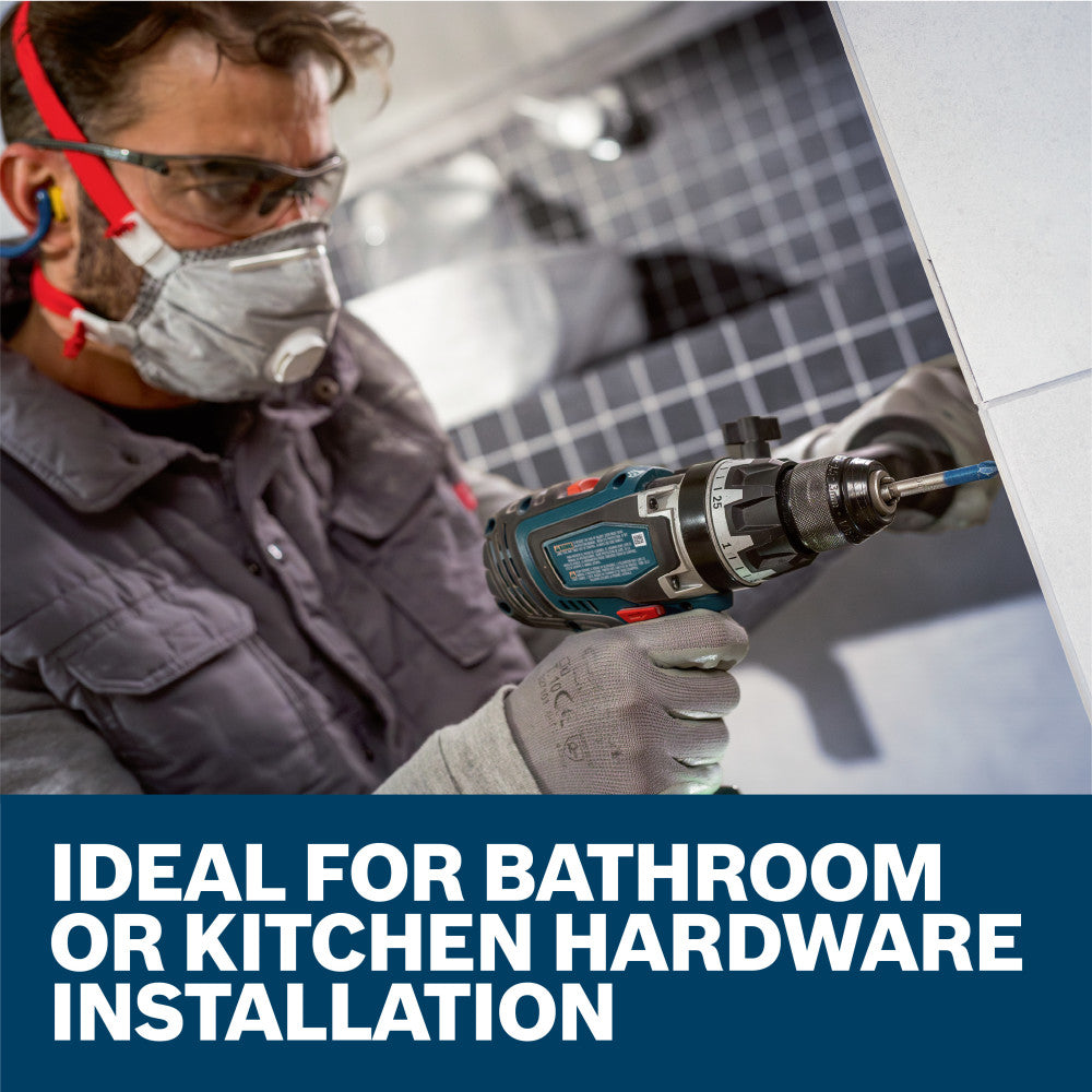 Bosch Porcelain Tile Bits are engineered for fast, accurate, and efficient drilling in hard materials like porcelain, ceramic, marble and granite tiles, and more. The durable carbide tip is optimized for ceramic tile drilling and delivers up to 5X more life than Bosch glass and tile bits. An innovative arrow-shaped design allows for faster, easier drilling with less friction, for reduced bit wear and tear, delivering extended life. The bit’s enhanced centering zone delivers easy positioning for more precise drilling. Experience maximum torque transmission and secure connection with the chuck through the impact-rated hex shank. After drilling through hard tile, utilize the included multi-material bits to tackle the material behind it and finish the job.