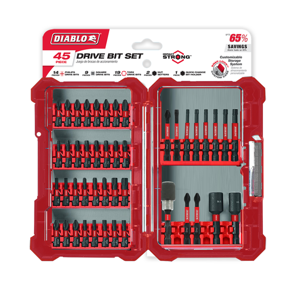 Diablo's hi-performance screw driving set delivers extreme durability and longer life in the installation and removal of fasteners. The included drive bits have an optimized tip design to provide a strong, precise grip that reduces wear, stripping and slippage. The magnetic nut setters and drive bit holder are designed with a high-strength, permanent magnet for a secure, anti-wobble grip when fastening screws and nuts. Torque Resistant Design absorbs torque for less stress at the tip. This set is Impact Strong™, delivering increased shank stability and durability in cordless and corded impact and drill drivers.