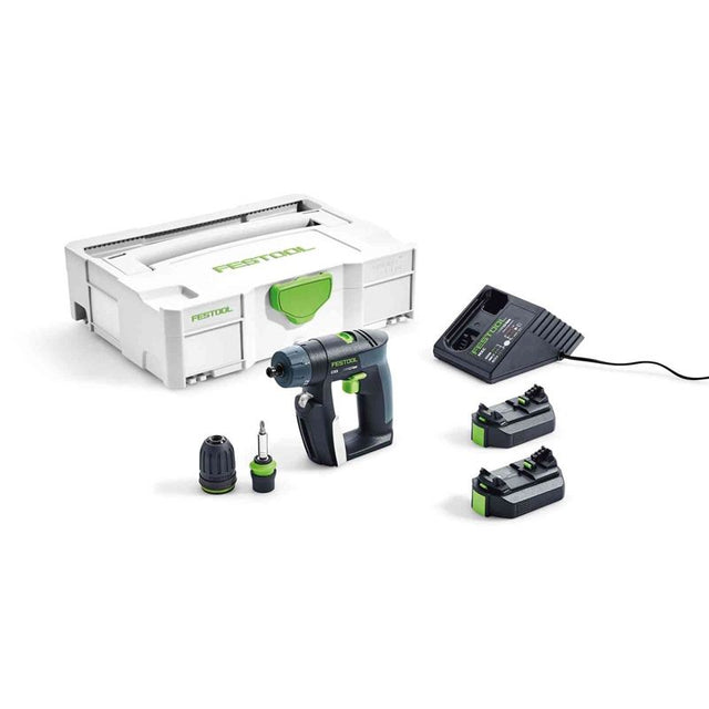 The CXS Compact cordless drill is by far the smallest, extension of Festool’s Li-Ion drill platform. Featuring the FastFix chuck system, the CXS can be used with the Centrotec chuck, keyless chuck, or an optional right angle attachment that allows you to access even the tightest spaces. As you would expect, the CXS features exceptional ergonomics, with a battery design that removes the bulk from the handle, ensuring maximum comfort over extended use. Weighing in just under 2 pounds with the Centrotec chuck attached, the CXS will not leave you feeling fatigued even after all day use. The CXS offers exceptional battery life and an ultra-low recharge time, fully recharging in just 45 minutes. The drill comes with two 10.8v 2.6Ah Lithium Ion batteries to keep you drilling and driving instead of waiting for a battery to recharge. The drill, charger and both batteries are covered by Festool's comprehensive 3-year warranty.