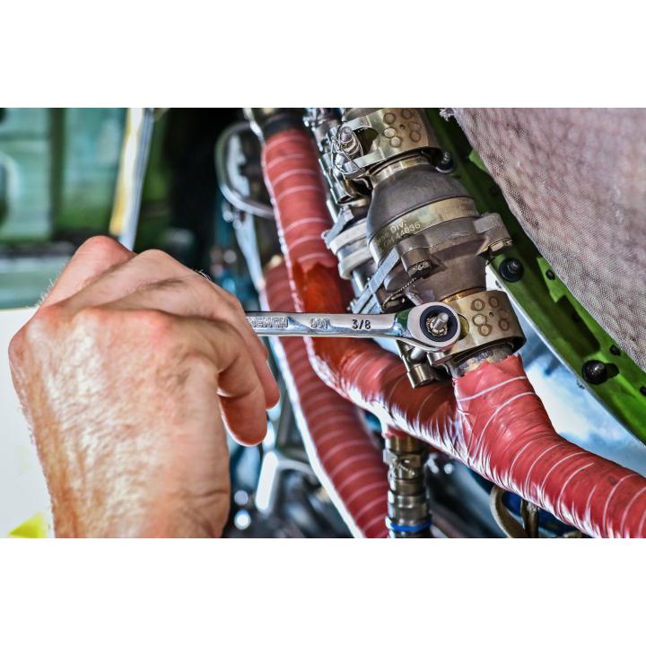 90-tooth ratcheting box end delivers a 4° swing arc to turn a fastener in tight spaces