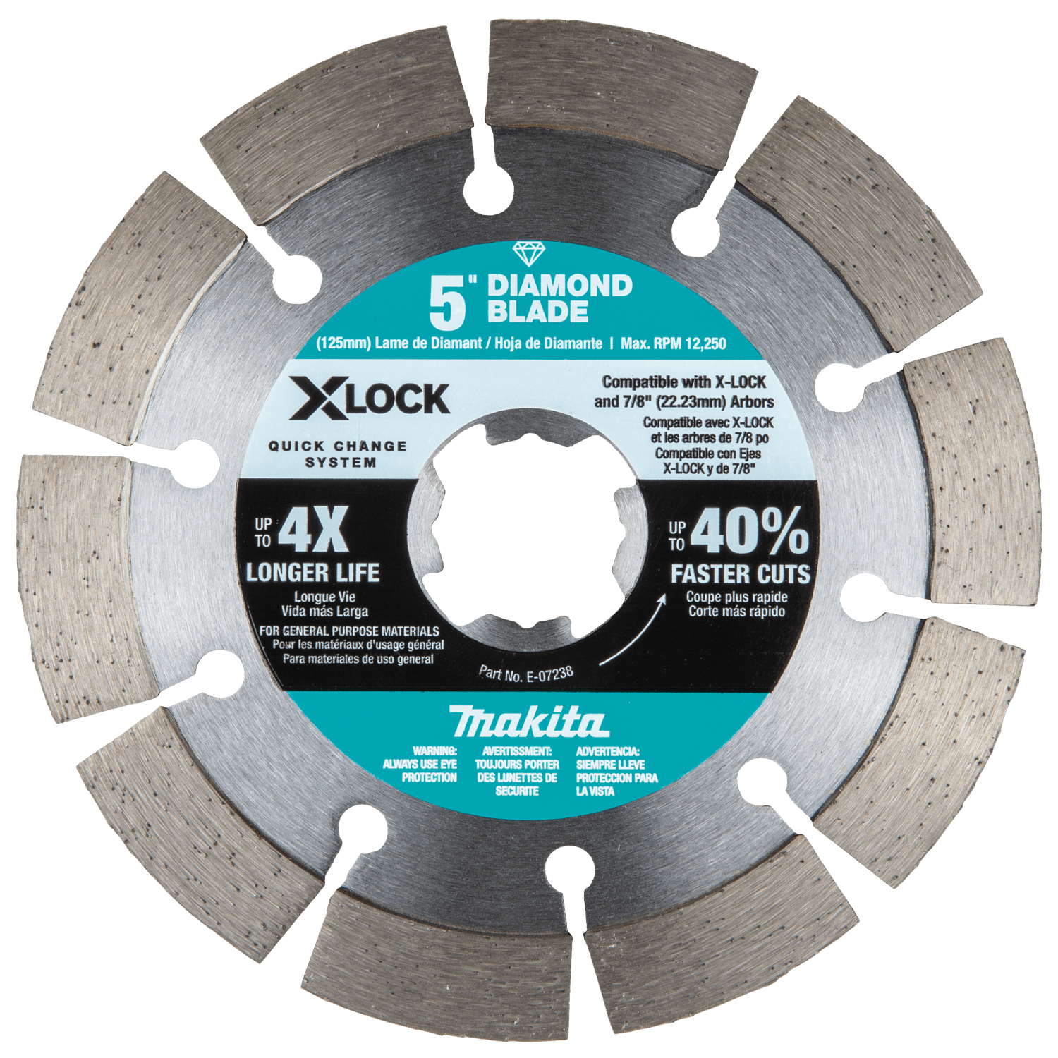 The X-LOCK Quick Change System provides up to 5X faster blade changes. The X-LOCK 5” Segmented Diamond Blade (E-07238) is designed for masonry cutting, including concrete, block, brick, pavers, and roof tiles. It is made with high-quality diamonds, carefully tensioned for less vibration, and features a segmented rim for faster, aggressive cutting. The blade can be used for dry or wet cutting. X-LOCK quick change system also allows for easy tool-free blade changes by simply pulling the release lever on Makita® X-LOCK Angle Grinders (sold separately).