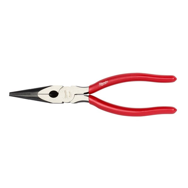 The Milwaukee 8 in. Long nose pliers feature a 2 in. gripping nose for pulling wire and material through rough-in holes and other tight spaces. The pliers head features integrated reaming ridges (patent pending) for removing burrs from the inside of smooth pipe as well as an integrated wire cutter. For added functionality, the Milwaukee long nose pliers feature an integrated fish tape puller. The Milwaukee long nose pliers are forged for strength and feature rust protection for long life.
