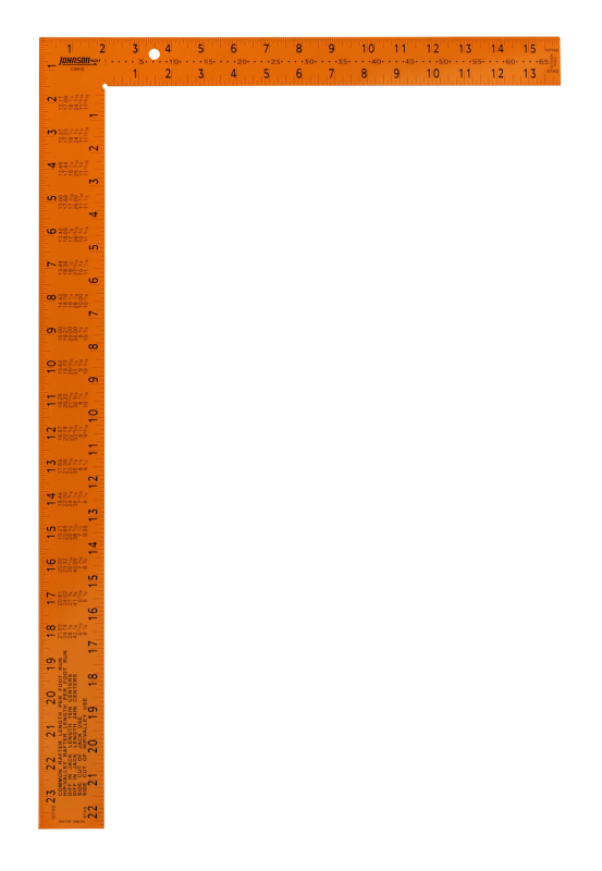 Johnson's 16" x 24" hi-visibility orange framing square features EZ Read™ numbers and graduations. This framing square is everything a builder needs to get the work done quickly, efficiently and accurately. It includes graduations in 1/8", 1/10", 1/12" and 1/16" as well as octagon scales, rafter tables, brace tables and board foot tables, making it useful for any number of different jobs. This framing square is a must-have for any carpenter or builder - it is handy for framing, layout, rafter and stair work, finding and establishing right angle, marking cut-off work and more!