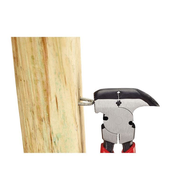 The Milwaukee fencing pliers feature a forged head for lasting durability through the toughest applications. The fencing pliers are designed with a multi-purpose design which incorporates a staple puller, staple pincher, fencing wire cutter, fencing wire puller, fencing wire crimper, and general purpose hammer. The fencing plier offer rust protection for tough jobsite conditions. The fencing pliers are designed with a curved handle with comfort grips that will not peel.