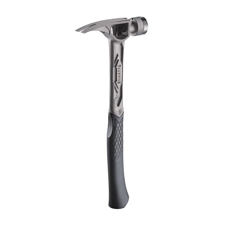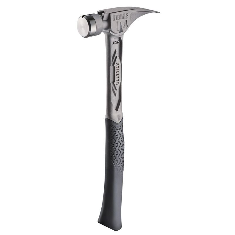 The STILETTO 14oz TIBONE Hammer with Smooth Steel Face and Curved Handle is our most powerful and most durable hammer. This All-Titanium hammer is 45 percent less weight and hits like steel. The durable TIBONE design is best for framing and pulling nails. The 180 degree Side Nail Puller and Magnetic Nail Starter fit up to 16D and Duplex Nails. The TIBONE features a replaceable steel face and multiple grip colors, extending the life of the hammer and providing a personal touch.INCLUDES: