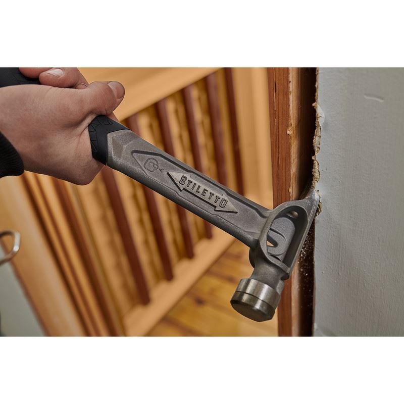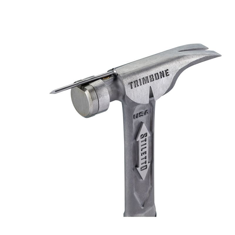 The STILETTO 10oz TRIMBONE Hammer with Smooth Steel Face and Curved Handle is designed for finish with specialized features. This titanium hammer is 45 percent less weight and hits like steel. The compact D-Face and Trim Claw are ideal for tight spaces. The TRIMBONE also features a steel face and a replaceable grip, available in 5 colors. extending the life of the hammer and providing a personal touch. The 180? side nail puller is ideal for 2D-10D nails but has the power to pull up to 16D.