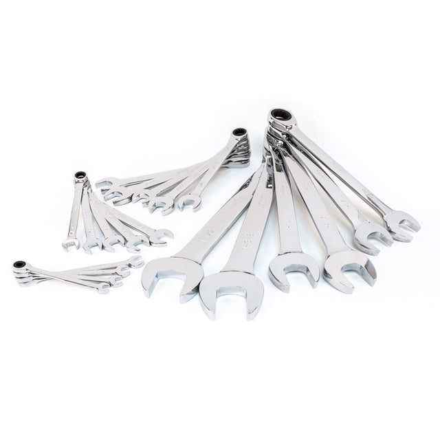 20 Piece Combination Ratchet Wrenches SAE20 pc SAE professional quality, bright fully polished, hard chrome ratcheting wrenches Sizes included: ¼â€, 5/16â€, 11/32â€, 3/8â€, 7/16â€, ½â€, 9/16â€, 5/8â€, 11/16â€, ¾â€, 13/16â€, 7/8â€, 15/16in, 1in, 1-1/16in, 1-1/8in, 1-3/16in, 1-1/4in, 1-3/8in, 1-1/2in 12 point, 72 tooth, 5 degree ratcheting box end and fast reaching open end wrench Wiha special chrome vanadium molybdenum tool steel, hardened for best wear resistance Wrenches feature off-corner loading to help prevent the damaging of fasteners 0° offset box-end allows for maximum clearance in tight spaces Open-end allows the wrench to be slid into position from the side of the fastener Chamfered lead-ins help provide fast and easy placement onto fasteners Exceeds ANSI standards