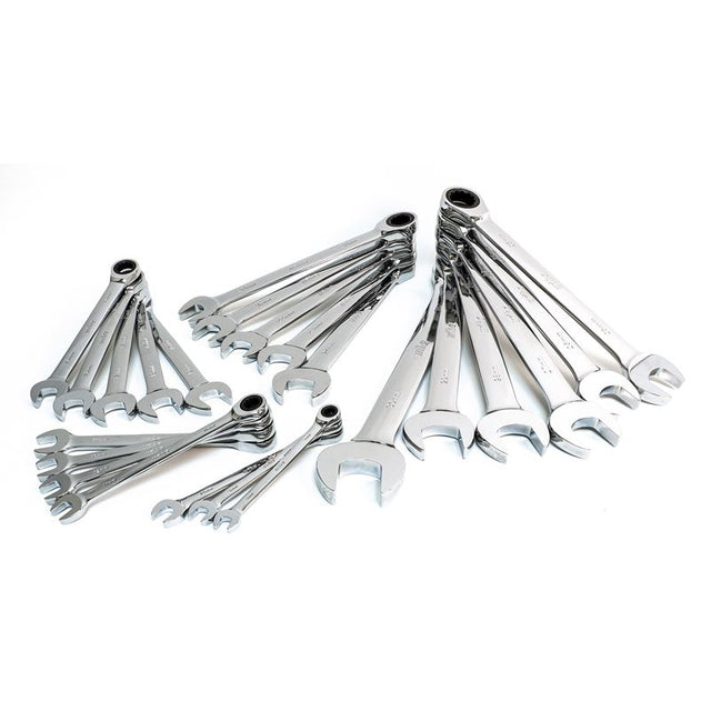 23pc Metric professional quality, bright fully polished, hard chrome ratcheting wrenches Sizes included: 8mm, 9mm, 10mm, 11mm, 12mm, 13mm, 14mm, 15mm, 16mm, 17mm, 18mm, 19mm, 20mm, 21mm, 22mm, 23mm, 24mm, 25mm, 26mm, 27mm, 28mm, 29mm, 30mm 12 point, 72 tooth, 5 degree ratcheting box end and fast reaching open end wrench Wiha special chrome vanadium molybdenum tool steel, hardened for best wear resistance Wrenches feature off-corner loading to help prevent the damaging of fasteners 0° offset box-end allows for maximum clearance in tight spaces Open-end allows the wrench to be slid into position from the side of the fastener Chamfered lead-ins help provide fast and easy placement onto fasteners Exceeds ANSI standards
