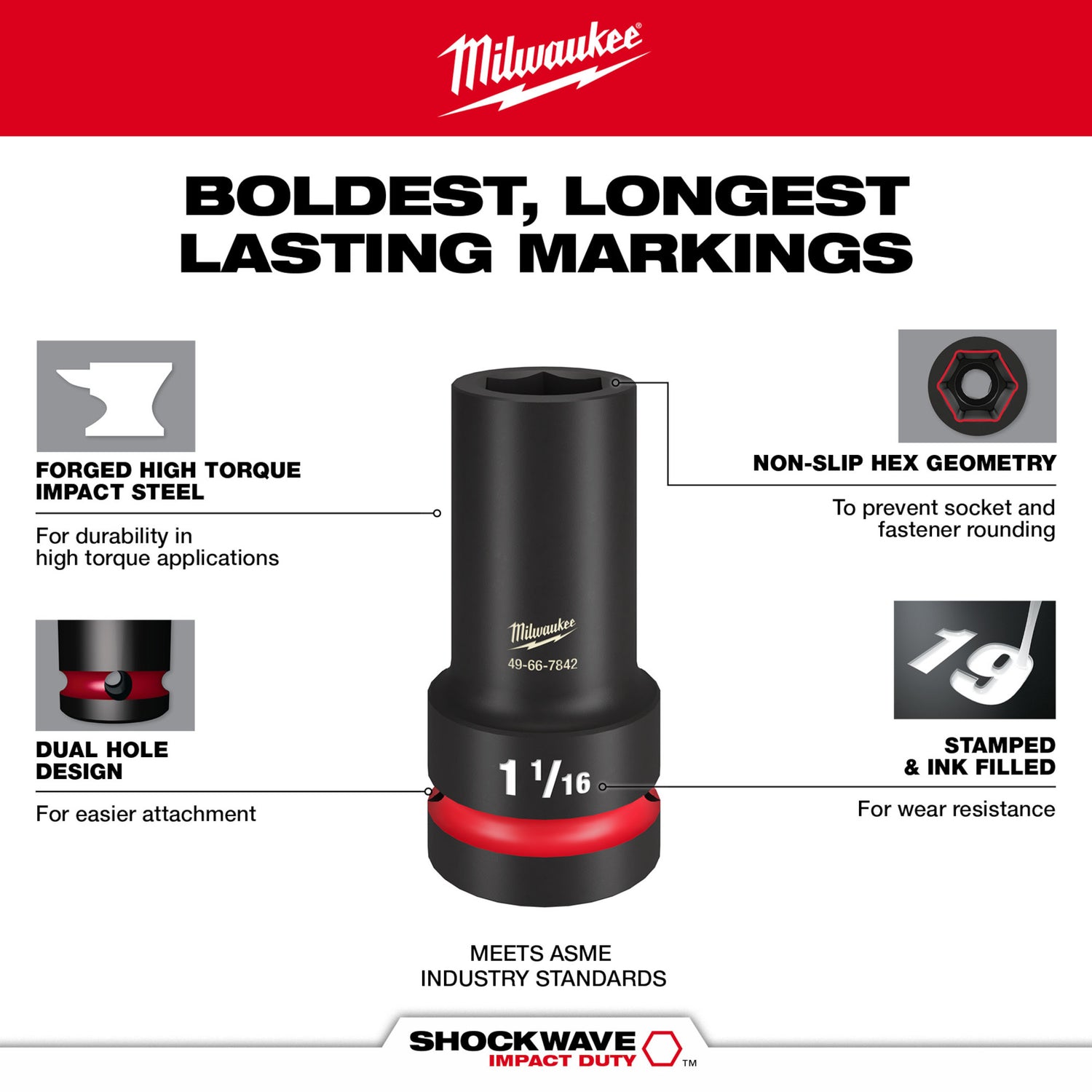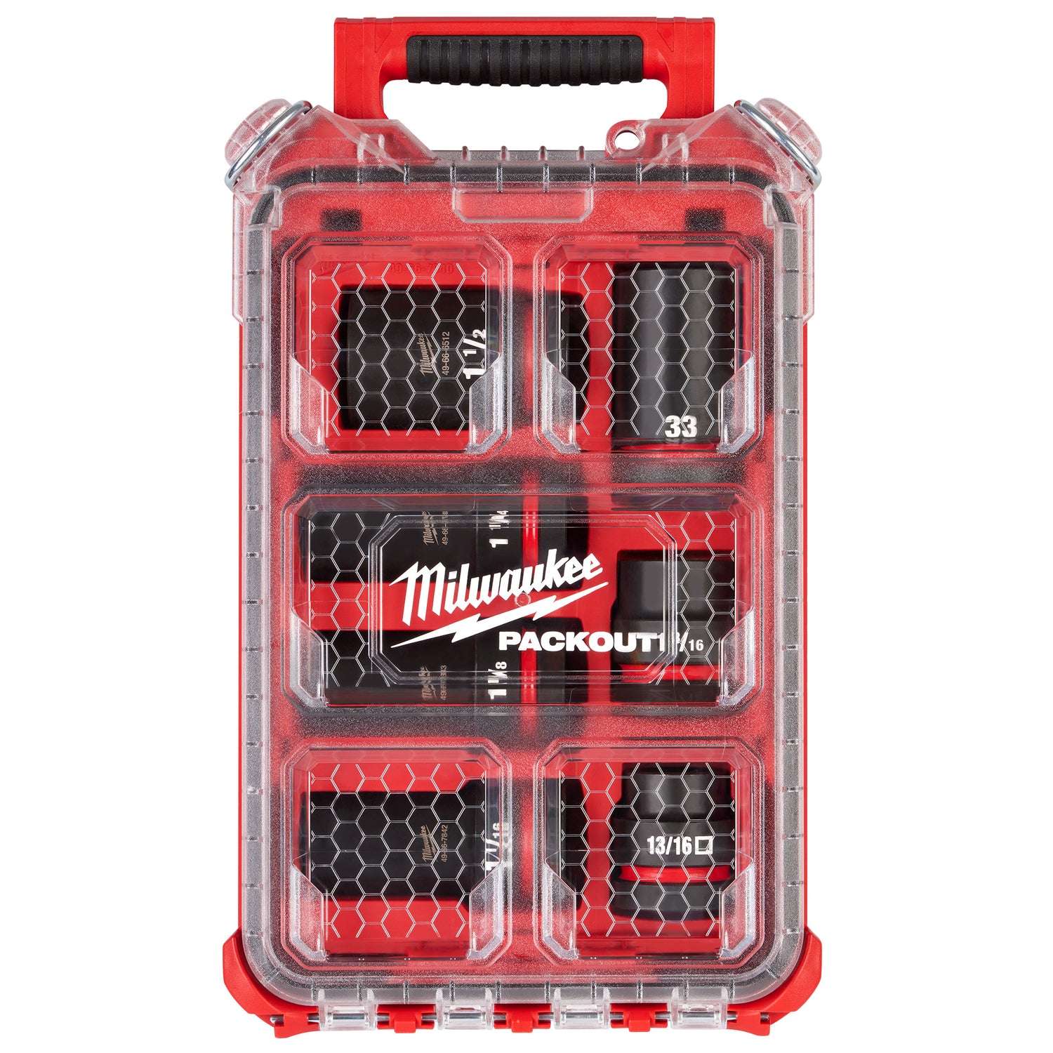 Our SHOCKWAVE Impact Duty™ 1" Drive 7PC MM & SAE Wheel Service Socket PACKOUT™ Set features the boldest, longest-lasting markings. The stamped and ink-filled size markings enable you to select the right socket every time throughout the life of the socket. The 4 and 6-point metric and SAE sockets are engineered with high-strength forged steel for optimized performance in high stress applications, and a non-slip hex geometry prevents fastener rounding. The dual-hole design and ring groove allow for easy socket attachment and removal. The set is organized in a PACKOUT™ Compact Organizer with a clear top for easy identification of parts at a glance. The Compact Organizer is part of our PACKOUT Modular Storage System, allowing for storage customization and easy transport of tools and accessories. All MILWAUKEE® SHOCKWAVE Impact Duty™ Sockets are backed by our Lifetime Guarantee and meet ASME industry standards.