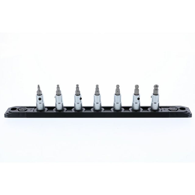 Ball End Hex Socket Set 1/4 Square Drive with 1/4in Replaceable Hex Bit 3/32, 1/8, 9/64, 5/32, 3/16, 7/32, 1/4in On RailWiha Easy Change Replaceable Bit Sockets For 1/4in Square Drive Ratchets Wiha special chrome-vanadium-molybdenum tool steel Ball End enables fastening and unfastening at an angle of up to 25° Through Hardened Industrial Bits: Chrome Plated polished Sockets Set screw holds bit securely Universal Socket Organizer Rail Sockets snap firmly into place for a secure hold