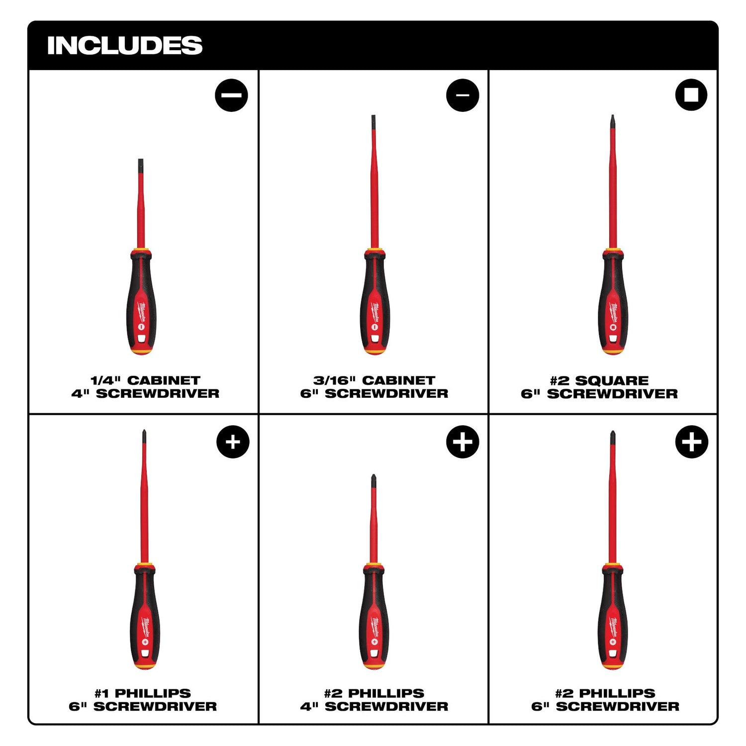 Includes Insulated Slim Tip Screwdrivers in sizes: 1/4" Cabinet x 4", #2 PH x 4", 3/16” Cabinet x 6”, #2 Square x 6”, #1PH x 6", #2 PH x 6"