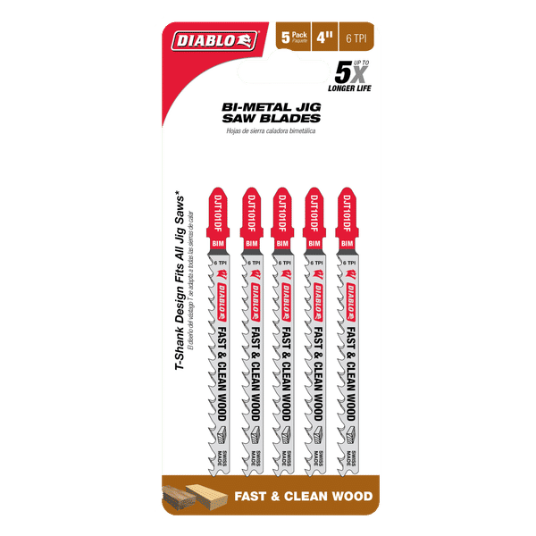 Diablo’s bi-metal teeth jig saw blades application are specifically designed for maximum durability, longer life and fast cuts in wood applications. These high-performance blades feature an ultra-hardened cutting edge to deliver up to 5X longer life than standard blades. The optimized tooth and blade designs provide fast, effortless and clean finishes. T-shank design fits all combo and most U-shank cordless and corded jig saws.