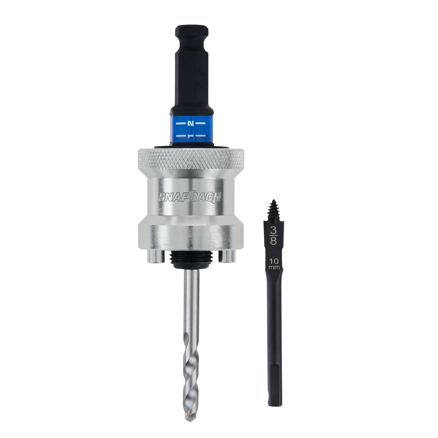 SNAP-BACK® 2-STEP RELEASE - Step 1) Unlock Hole Saw, Step 2) Unlock Pilot Bit
