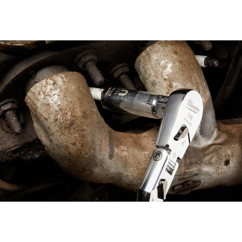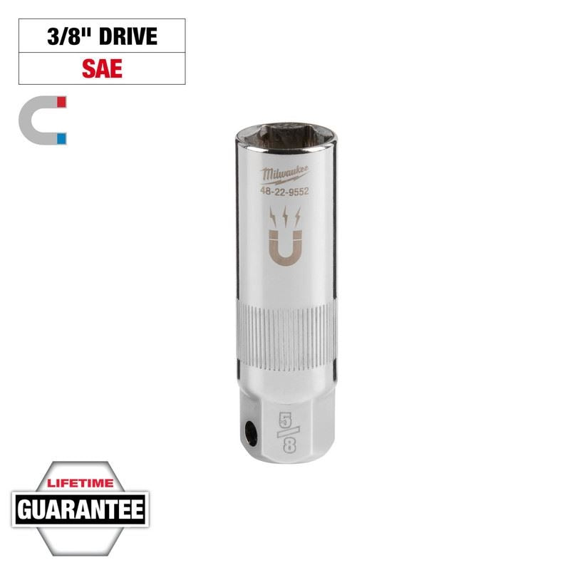 The MILWAUKEE 3/8in Drive 5/8in 6 Point Magnetic Spark Plug Socket features an amplified rare earth magnetic retainer that balances a secure fit with smooth removal of the spark plug from the socket. A precision knurling on the outside of the socket allows for better control when hand tightening or loosening. Both the socket and retainer withstand harsh chemicals commonly found in the garage. Stamped size markings make it easy to identify the size of the socket. The external hex at the base of the socket fits an 11/16 wrench for added control. Milwaukee Spark Plug Sockets are backed with a Lifetime Guarantee.INCLUDES: