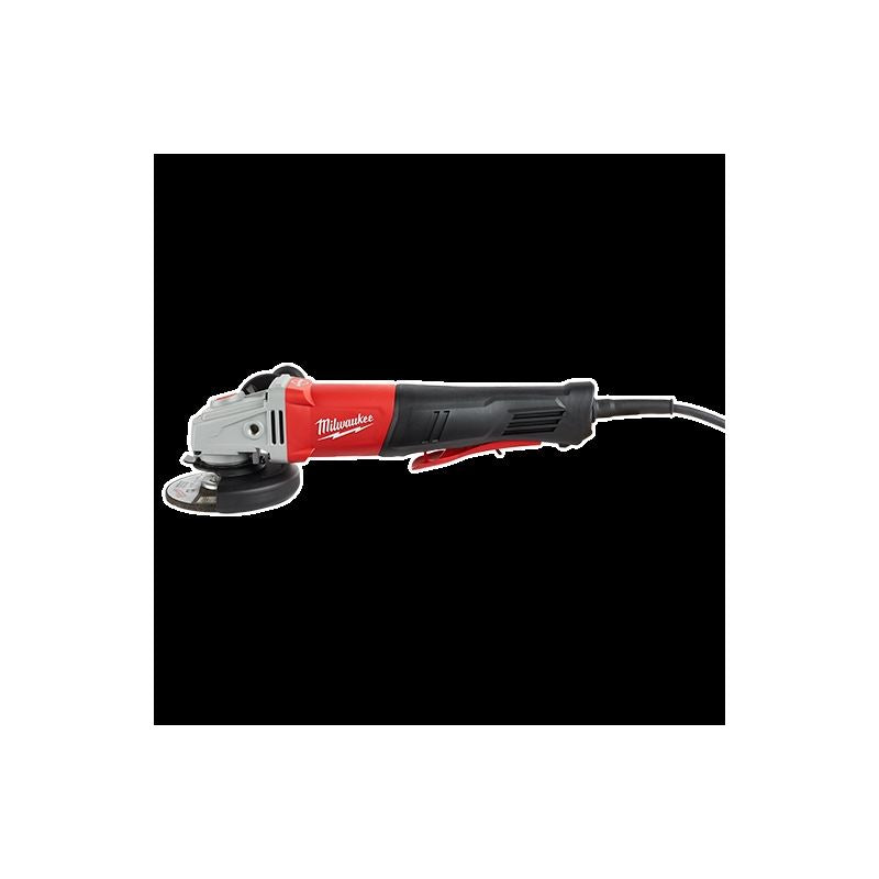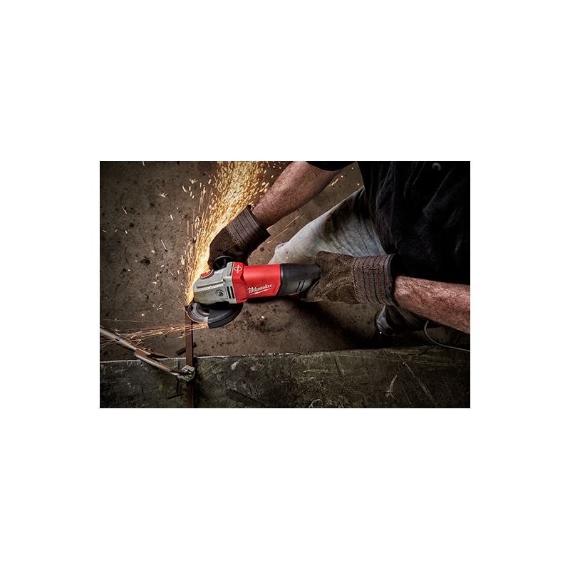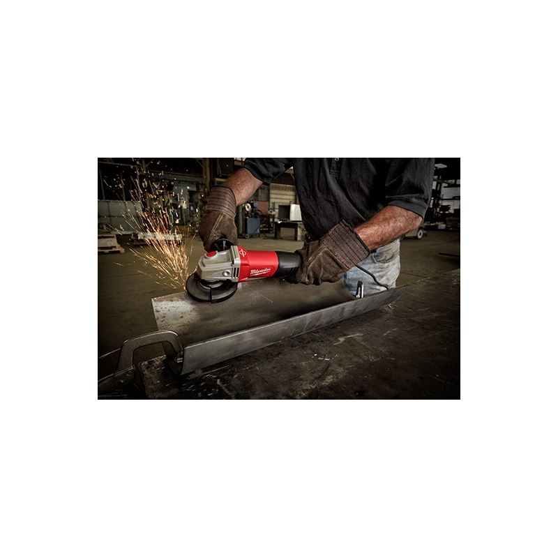 Our 11 Amp 4-1/2" / 5" Braking Small Angle Grinder (Paddle, No-Lock) gives you up to 3X more durability and up to 50% more power than the competition. The Rapid Stop braking feature is integrated into the tool and stops all accessories in 2 seconds or less. A 1,400 MWO motor allows you to power through the toughest jobs and is the perfect match for industrial users. The angle grinder's grip circumference is a full 2" less than the competition, providing you with more control and less fatigue throughout the day. The grinder also features Overload Protection to maximize motor life, an Electronic Clutch that extends your tool's life and helps prevent bind-up, Line Lock-Out that prevents automatic start-up after power loss and Soft Start. The grinder is lanyard-ready with an incorporated lanyard loop on the handle. The corded grinder's 100% tool-free design allows you to change all accessories, including hubbed product, without a wrench. Additionally, a tool-free, burst resistant, adjustable guard allows you to make quick guard installations and adjustments.
