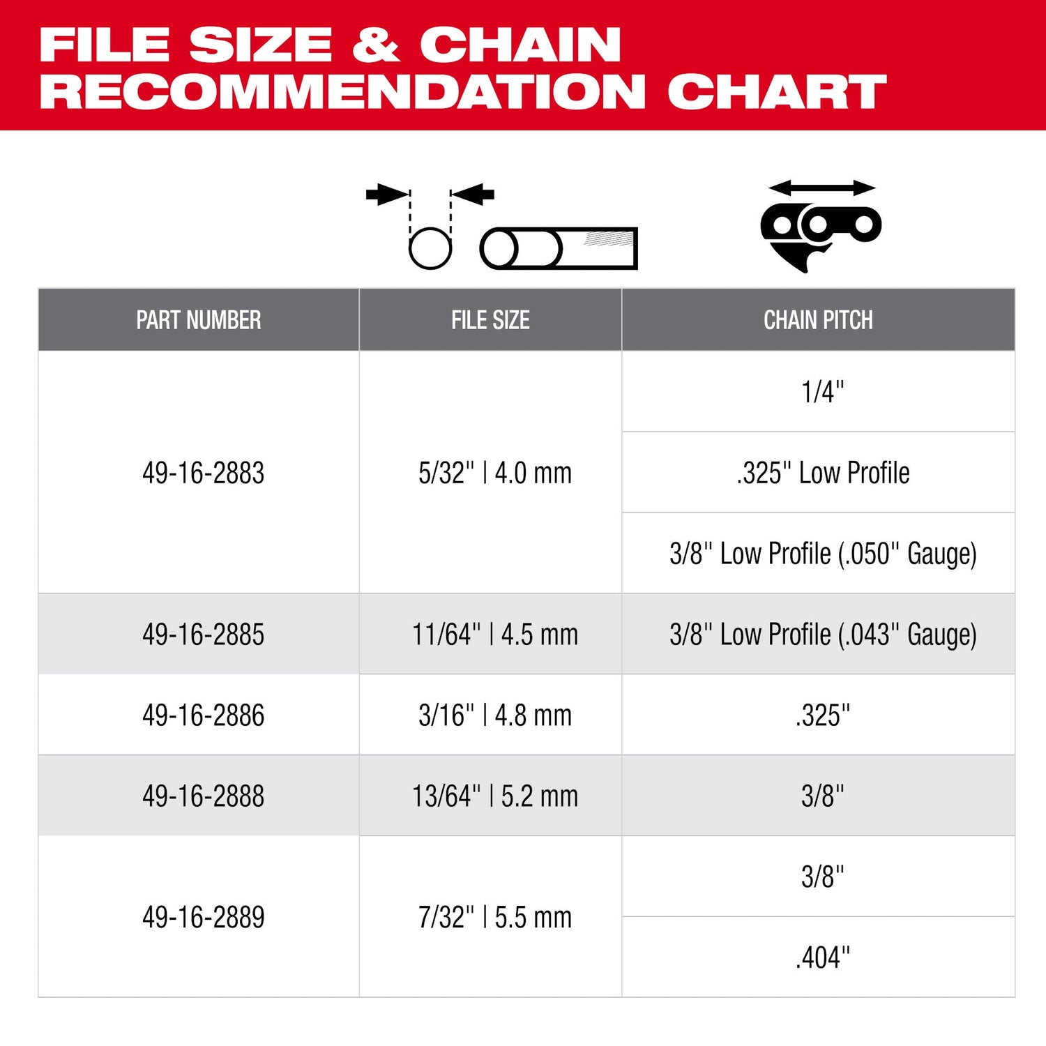 Our 9pc Saw Chain Sharpening Set with PACKOUT™ Low-Profile Compact Organizer is the ultimate organization solution that offers fast, efficient sharpening. The Milwaukee Round Files offer fast sharpening for less downtime, and the Milwaukee Handles are designed for fast, easy file swaps. The organizer is IP65 rated to help protect against rust and is impact-resistant. The set includes (2) 5/32", (2) 3/16", (1) 7/32" Round Files, (1) Flat File, (1) Round File Handle, (1) Flat File Handle, and (1) Depth Gauge.