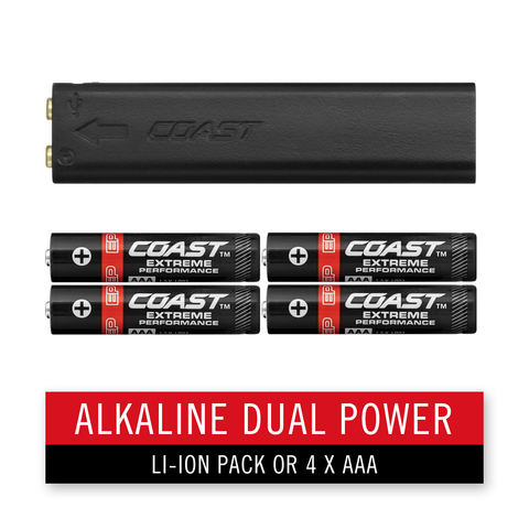 Alkaline Dual Power - Each COAST Alkaline-Dual Power is compatible with COAST Extreme Performance alkaline batteries and other standard alkaline batteries. Each product can also be powered with a COAST ported ZITHION-X™ rechargeable battery. This offers you the convenience of alkaline and the cost efficiency of rechargeable battery.