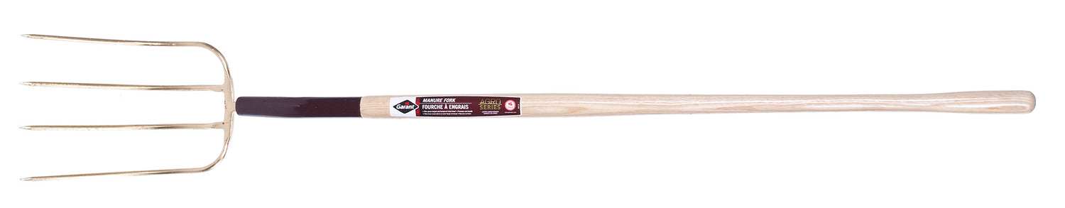 Lift, move and mix fertilizer, manure or compost with the help of the Garant manure fork. This tool is equipped with an ultra-robust head made of a single piece of forged and tempered steel. Its 4, 13\" (33 cm) tines are sharp and narrow for better manipulation of the manure. This manure fork is designed especially for farmers looking for a robust, efficient and comfortable tool.